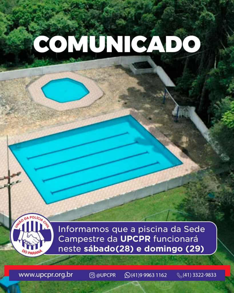 A UPCPR informa aos seus filiados que a piscina da Sede Campestre estará aberta neste sábado(28) e domingo(29).