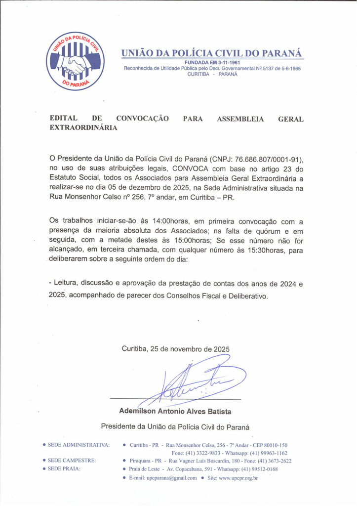 O Presidente da União da Policia Civil do Paraná (CNPJ: 76.686.807/0001-91), no uso de suas atribuições legais, CONVOCA com base no artigo 23 do Estatuto Social, todos os Associados para Assembleia Geral Extraordinária a