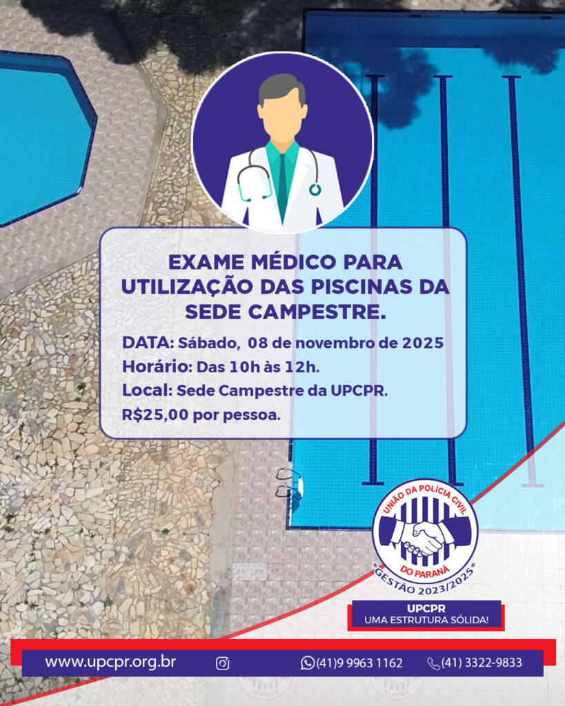 Neste sábado, 08 de novembro de 2025, será realizado o exame médico obrigatório para utilização das piscinas da Sede Campestre da UPCPR.
