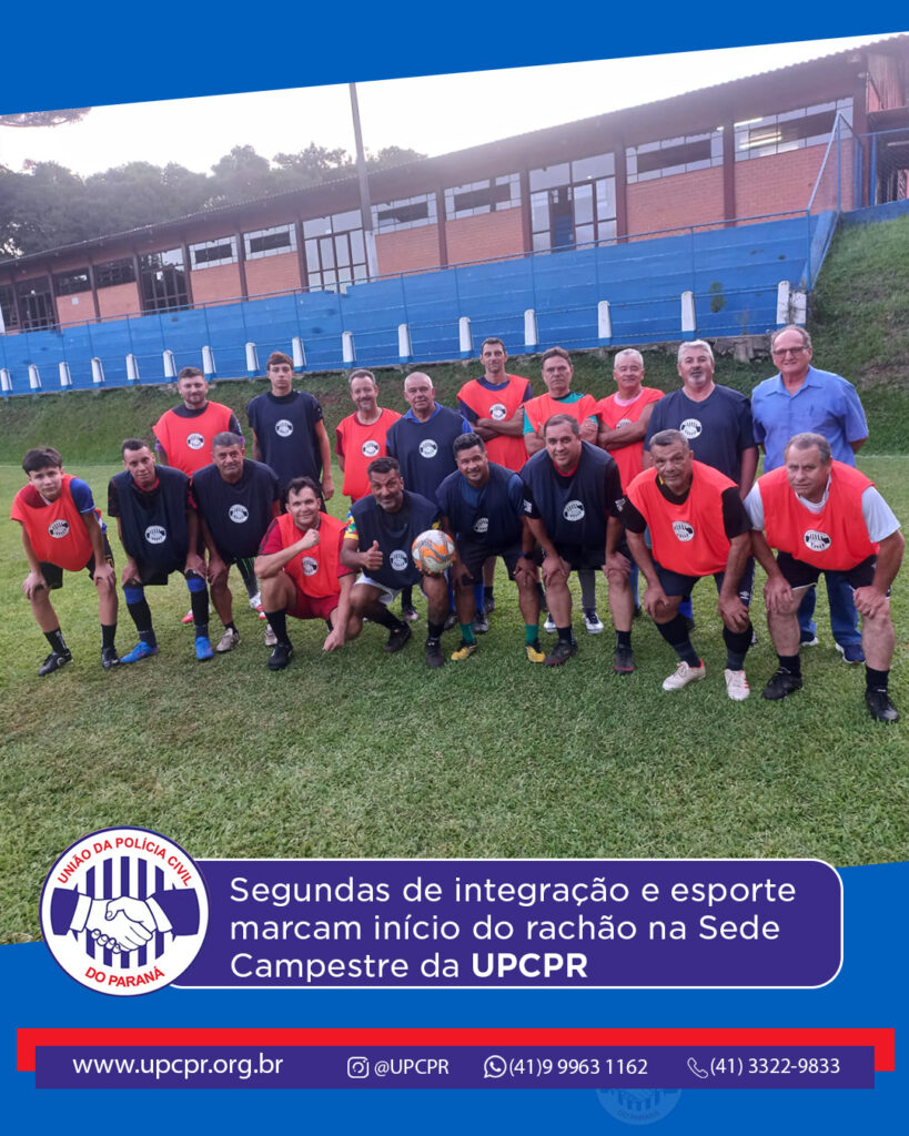 A semana começa com energia, integração e espírito de união na Sede Campestre da União da Polícia Civil do Paraná (UPCPR). Todas as segundas-feiras, a partir das 17h45, associados se reúnem para o tradicional “rachão”, um momento que vai muito além do futebol: é encontro de amigos, troca de experiências e fortalecimento dos laços entre colegas da Polícia Civil.